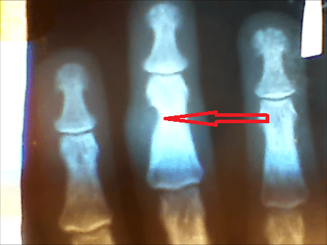Еще в 2005 году я стал замечать, что у меня на второй фаланге среднего пальца левой руки появилась какая-то ямка и как будто-бы в кости и эта «бяка» стала временами беспокоить, особенно при физических нагрузках ( и по закону бутерброда как правило по ночам). Во время очередного годового медосмотра(кто служил знает его заставляют проходить всех) я обратил внимание на это хирурга (еще один совет, не бойтесь во время таких осмотров обращать внимание специалистов на свои проблемы — помните «спасение утопающих дело рук самих утопающих»). Он послал меня на рентген см. снимок № 1. То что я там увидел меня очень расстроило, а еще больше расстроил комментарий хирурга. Он заявил что такое заболевание практически не излечимо и меня ожидает ампутация фаланги, если я раньше её не сломаю. Меня такой поворот событий конечно же не устраивал.